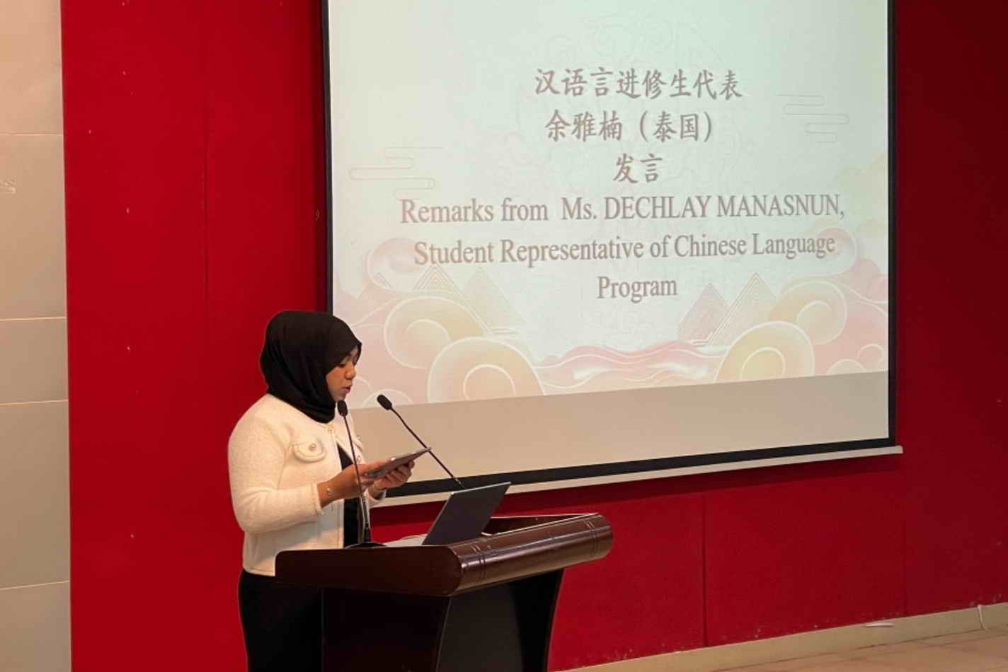 泰国籍学生余雅楠(DECHLAY MANASNUN)作为汉语进修生代表发言。她首先感谢老师们对自己的关心和帮助,随后分享了自己生活与学习的感受,她鼓励多参与社会实践活动来磨练和提高汉语。