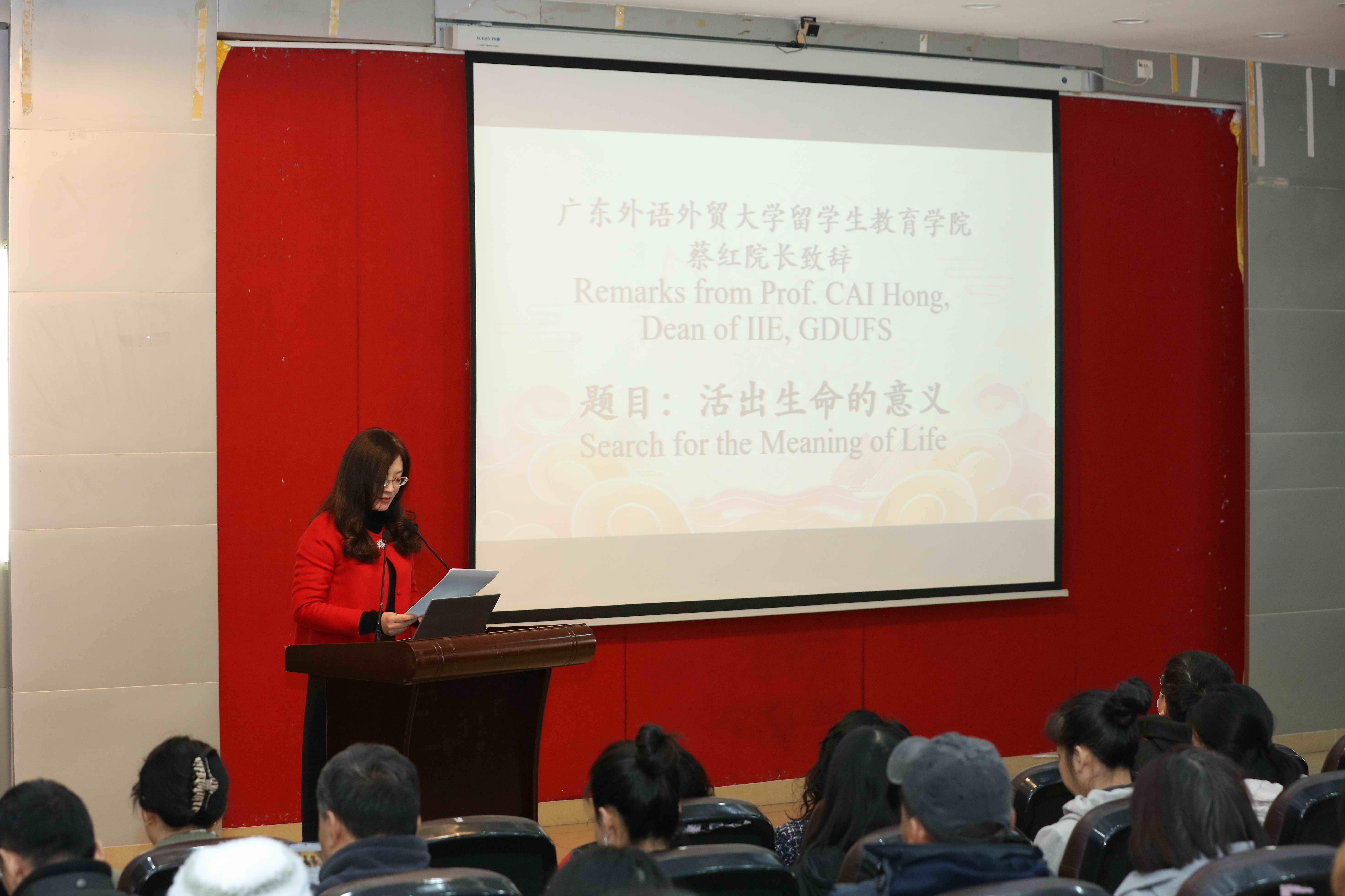 蔡红院长首先代表全体教职工,向本学期在广外求学的各国同学们表示祝贺,预祝大家取得优异成绩。她希望同学们都能投入到真实的生活,与自己、与他人、与世界建立真实的连接,认真地去思考学习和实践探索,这样的时间才真正属于每一个人,才能在时间的流逝中成就终极使命,成为独一无二的自己。
