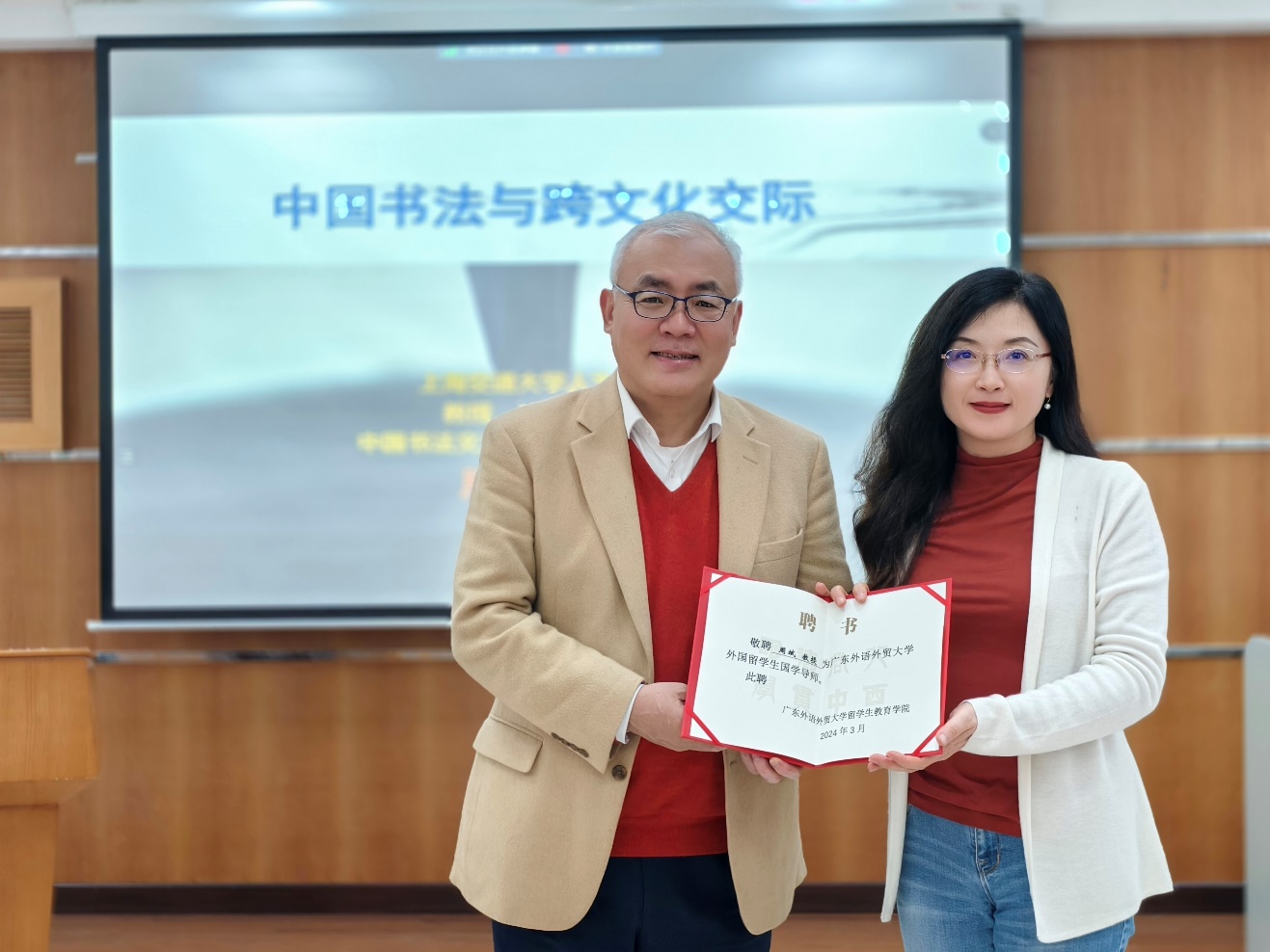 2024年3月13日,上海交通大学人文学院长聘教授、书法跨文化心理学研究方向博士生导师、中国书法文化国际传播研究所所长、联合国总部新闻部NGO组织 “国际书法联合会”主席周斌教授获聘我校首位外国留学生国学导师,留学生教育学院蔡红院长向周斌教授颁发聘书。