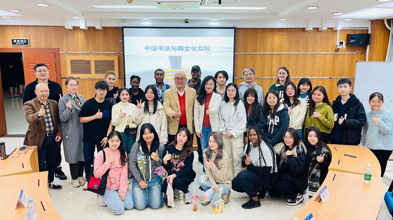 随后,周斌教授开展了题为《中国书法文化与跨文化传播》的讲座。此次讲座在第九教学楼103课室和腾讯会议同步进行,讲座由留学生院院长蔡红主持。参加此次讲座的有我校中外学生以及省内兄弟院校的国际学生。