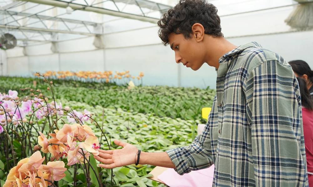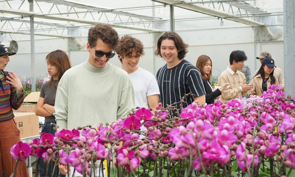 国际留学生在大棚观赏兰花
