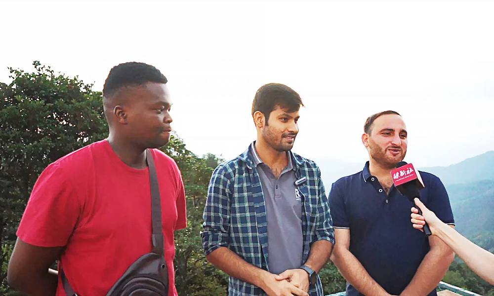 Ihsan(巴基斯坦,右)、Zahid(巴基斯坦,中)和Teddy(津巴布韦,左)向记者分享来到青云山的感受