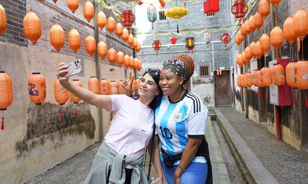课上的所学所悟很快就“派上了用场”。当天下午,国际留学生们便来到了“中国围楼文化之乡”——韶关市始兴县,参观满堂客家大围。满堂客家大围至今保存完整,是广东省最大的砖瓦结构围楼,也是民居建筑中“方围”的杰出代表,有“岭南第一围”之誉,是全国重点文物保护单位。当前,满堂客家大围也成为了创新围楼保护和活化方式的标杆案例,当地大力发展“围楼+旅游”“围楼+综合服务”“围楼+创意产业”,让古围楼在新时代焕发出新的光彩。穿梭于围楼之中,行走于青砖井台之间,让人仿若穿越时空,与中国民间文化进行了更深层次的链接。“我的祖国也有很多城堡式建筑,但当我亲眼看到客家围楼的时候,仍然被它的建造方式所震惊。”来自俄罗斯的Danila告诉记者,客家围楼既保留了古韵,又在历史长河中不断融合了近代审美的雅致,让他感到惊叹。