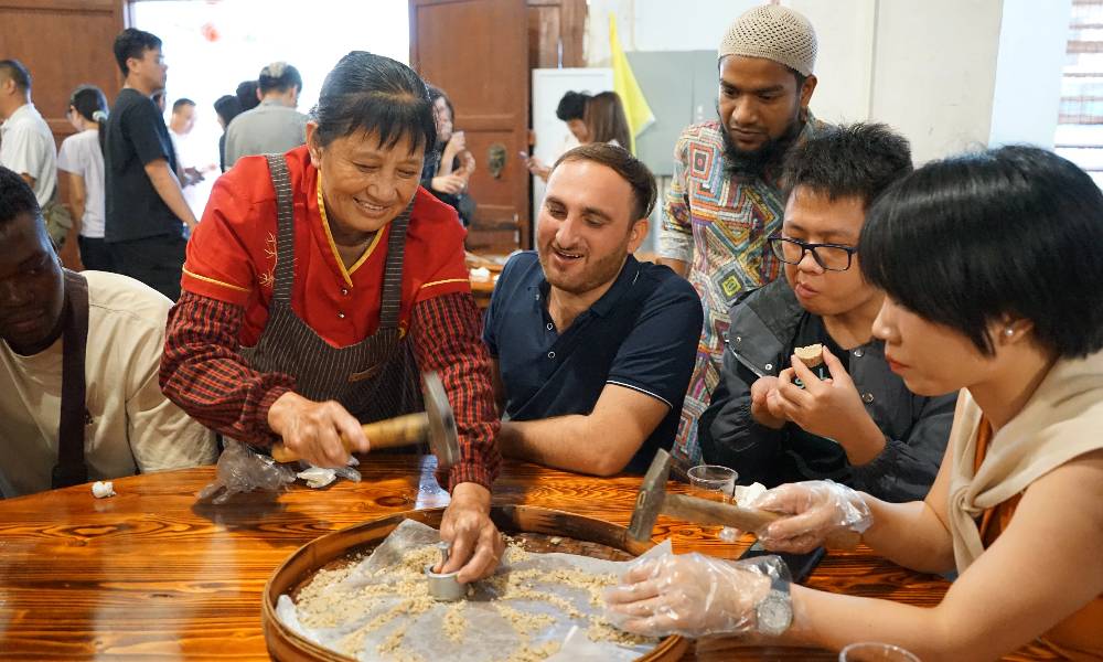 湖心坝民居群也是粤北地区极具代表性的客家建筑之一。位于仁川河畔,坐西南向东北,湖心坝民居群保存着59座明清时期建造的客家围楼,被誉为“粤北客家第一村”。来自苏丹的Sara细细走遍了围楼的每个角落,“这里有卧室、厨房、厅堂、小型学堂,甚至还有留给家畜的房间,感觉整个村庄都像一个家庭一样生活,村民邻里的关系非常亲密,令我非常着迷。”在充满生活气息的湖心坝里,国际留学生们还品尝了由村民精心制作的地道小吃“油罩糍”,体验了非物质文化遗产项目——客家米饼制作技艺,用味蕾体验客家文化的魅力。“米饼很特别很好吃,还特别容易制作。”Sara对记者说,“我对中国文化很感兴趣,无论是中国的服饰、建筑,还是食物,都有其独特的内涵并丰富了人们生活的方方面面。”