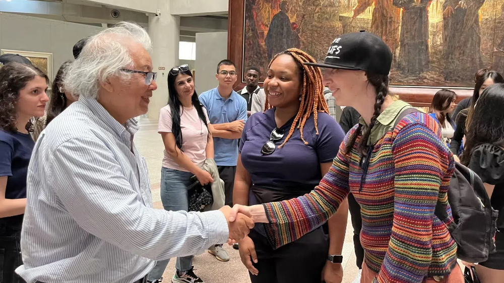 国际留学生驻足欣赏涂志伟先生的作品