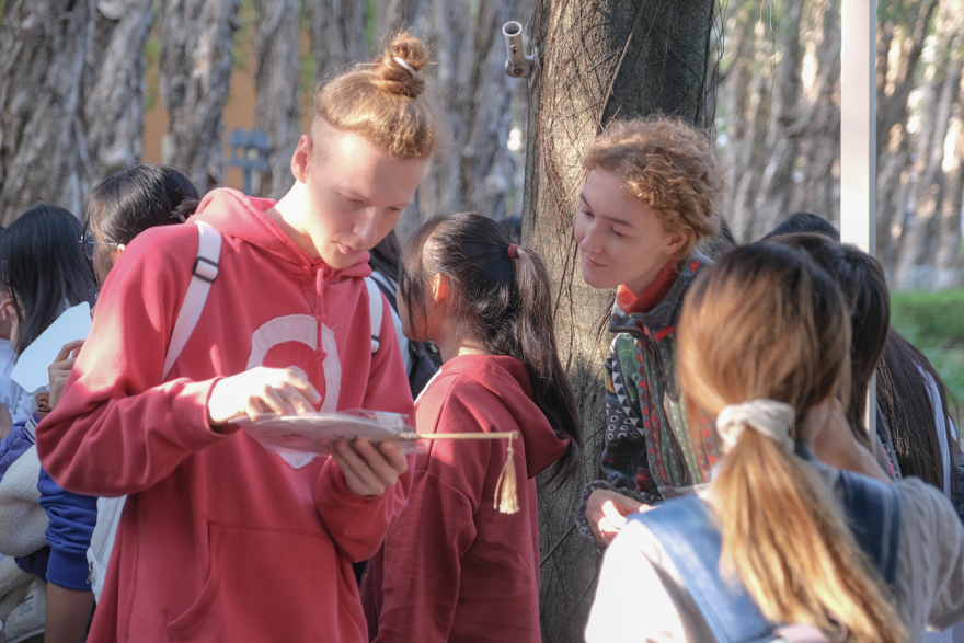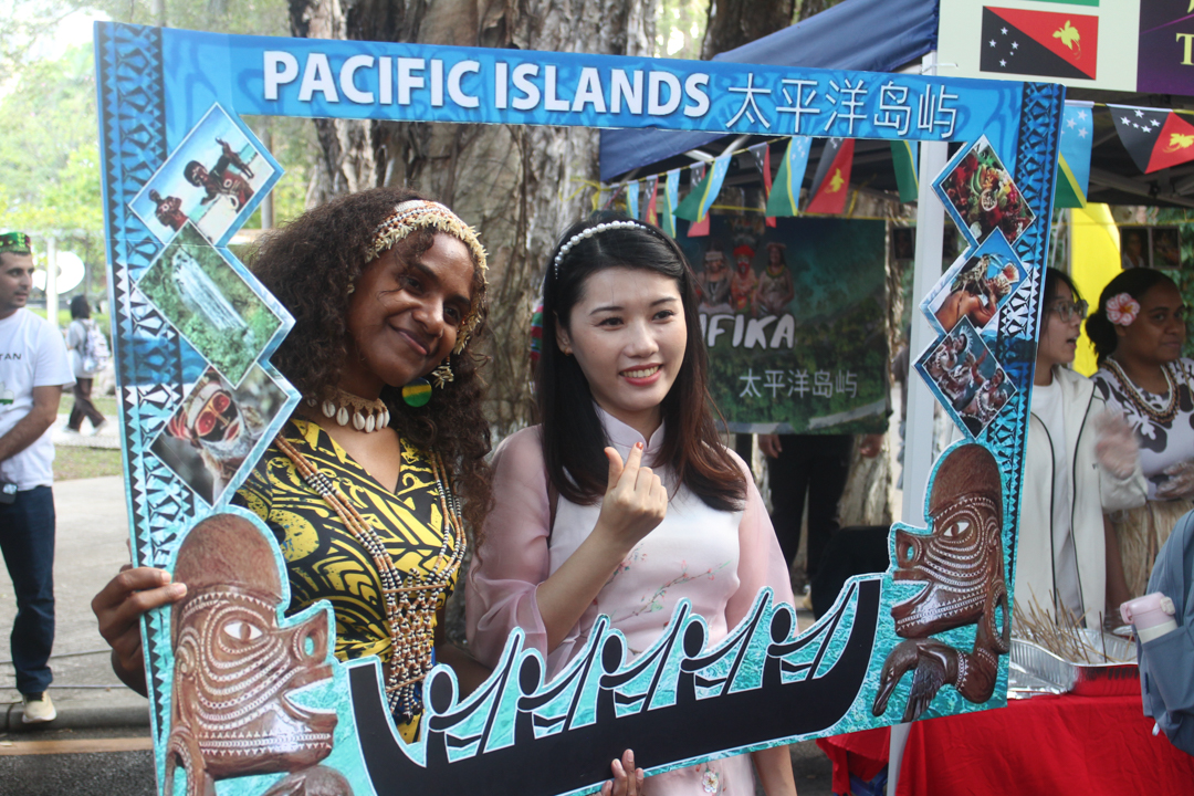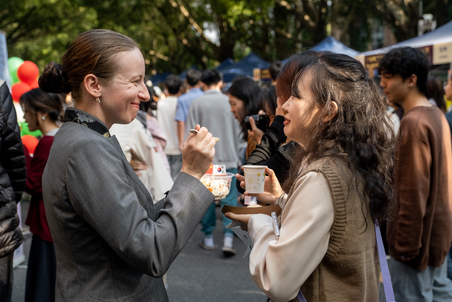除了琳琅满目的美食可供品尝,各个摊位也在现场布置和表演上用尽心思。秘鲁摊位悬挂的文化展示牌,向我们介绍了秘鲁的自然地理、人文风情和国家历史;俄罗斯、越南摊位的外国友人身着鲜艳的民族服饰,挥舞特色的旗帜,载歌载舞,引起众多同学们围观加入。鼓点节奏轻快,学生与外国友人们在阳光下携手共舞、鼓掌欢呼,场面热闹欢快。