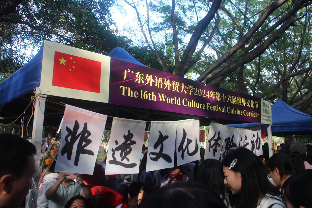 作为本次活动的东道主,美食长廊还特设“非遗文化摊位”展示漆扇文化。水墨交织,场面互动性与审美性兼具的同时,向世界展示了中国对本土文化的自信。“这次活动让许多同学对非遗文化产生了浓厚的兴趣,更愿意去学习了解了。”来自波兰语专业的非遗摊位的志愿者张同学如是说。除此之外,广外创意文化中心也设有展示本校文创作品的摊位,富于广外特色的校徽、笔记本等文创吸引大批同学欣赏、购买。