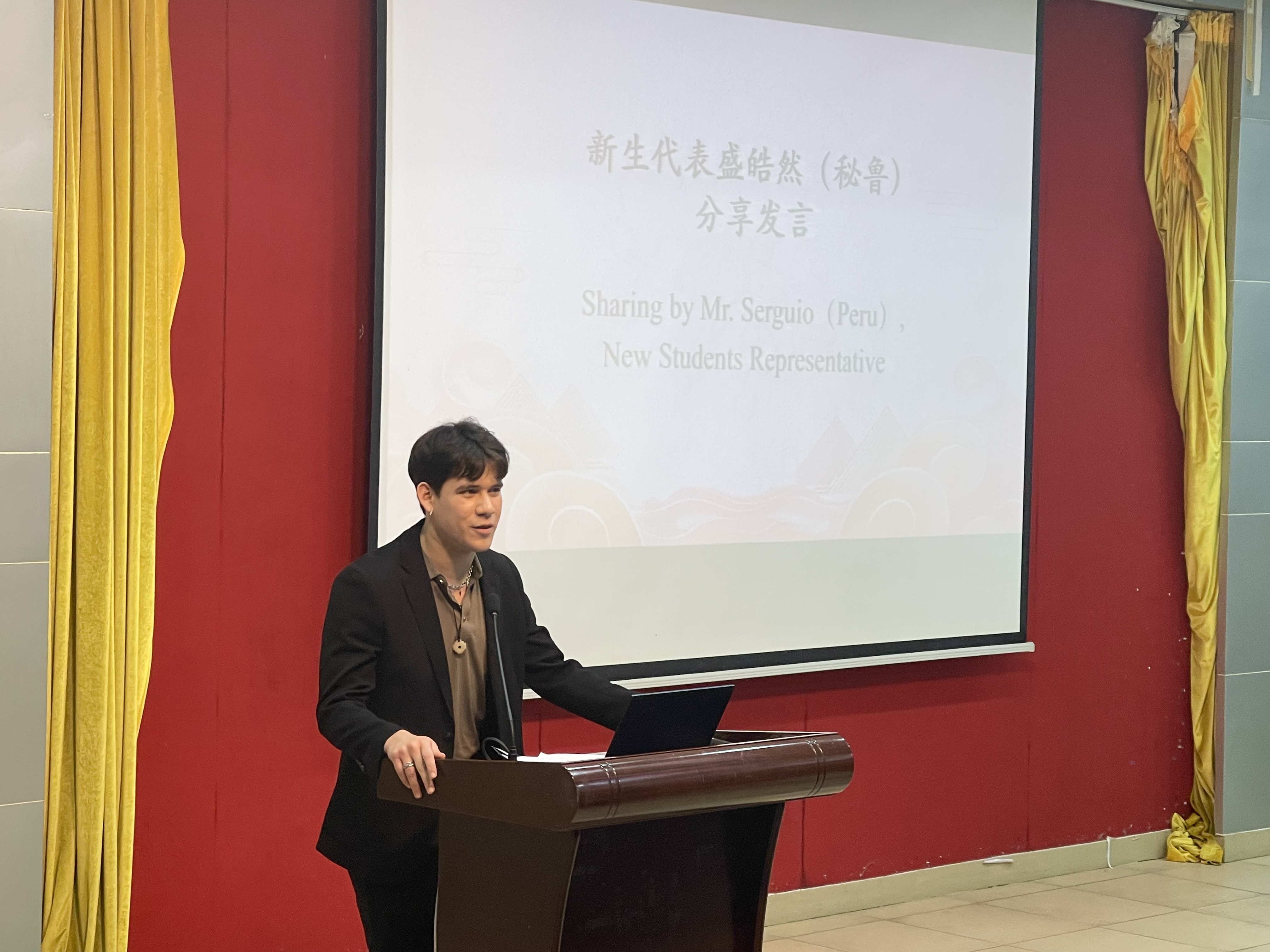 来自秘鲁的学生盛皓然Serguio作为新生代表,用热情洋溢的发言赞扬了同学们前往异国求学、独立面对未知未来的勇气;他以“四海之内皆兄弟”为引,道出了与大家共同成长的真挚愿望;结束语“长风破浪会有时,直挂云帆济沧海”,更是深切表达了对自己与全体同学的勉励,展现出对未来的无限憧憬与坚定信念。