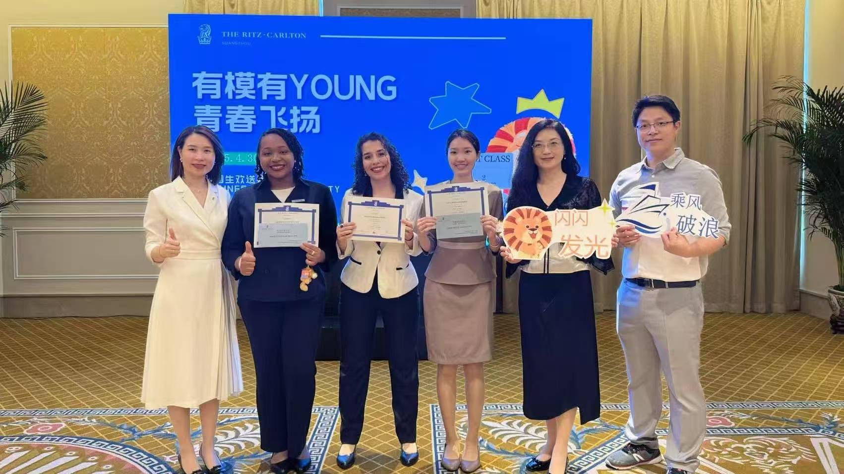 2025年春季学期,我校共有五位分别来自秘鲁、加拿大、美国、西班牙和意大利的留学生,在广州富力丽思卡尔顿酒店顺利完成了广交会实习项目。五位留学生实习期间的表现,得到了人事和工作部门领导同事的一致好评,在酒店举办的实习欢送会上均获得了结业证书以及免面试意向书。