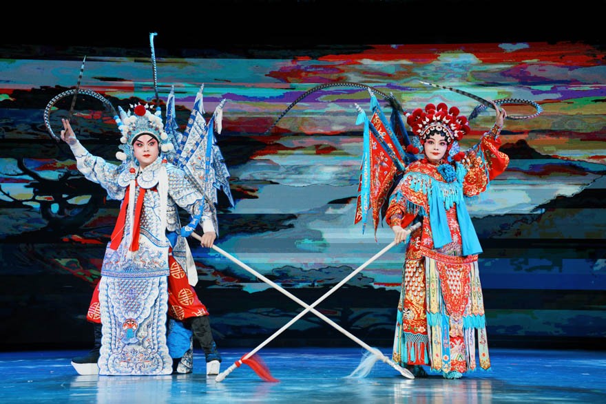 特别值得一提的是,当晚还迎来了广州粤剧院陈美娟、陈骏昱两位演员的倾情演出。他们带来了粤剧经典剧目《穆桂英招亲》,演员们以传统唱腔、程式化武打动作和典型刀马旦造型生动演绎宋代巾帼英雄穆桂英与杨宗保的故事,现场观众反响热烈,不少留学生用手机记录下表演精彩瞬间,纷纷表示“粤剧的服饰和身段设计令人惊艳”。