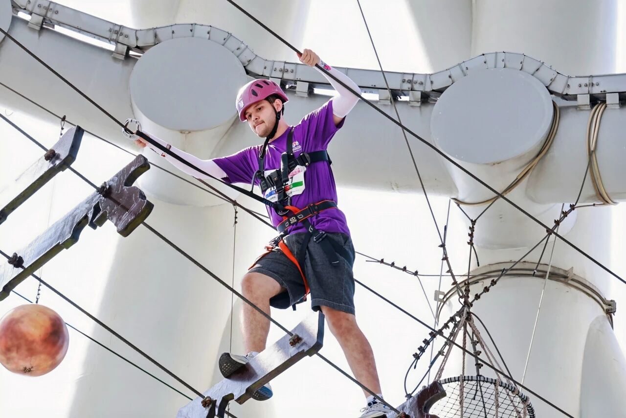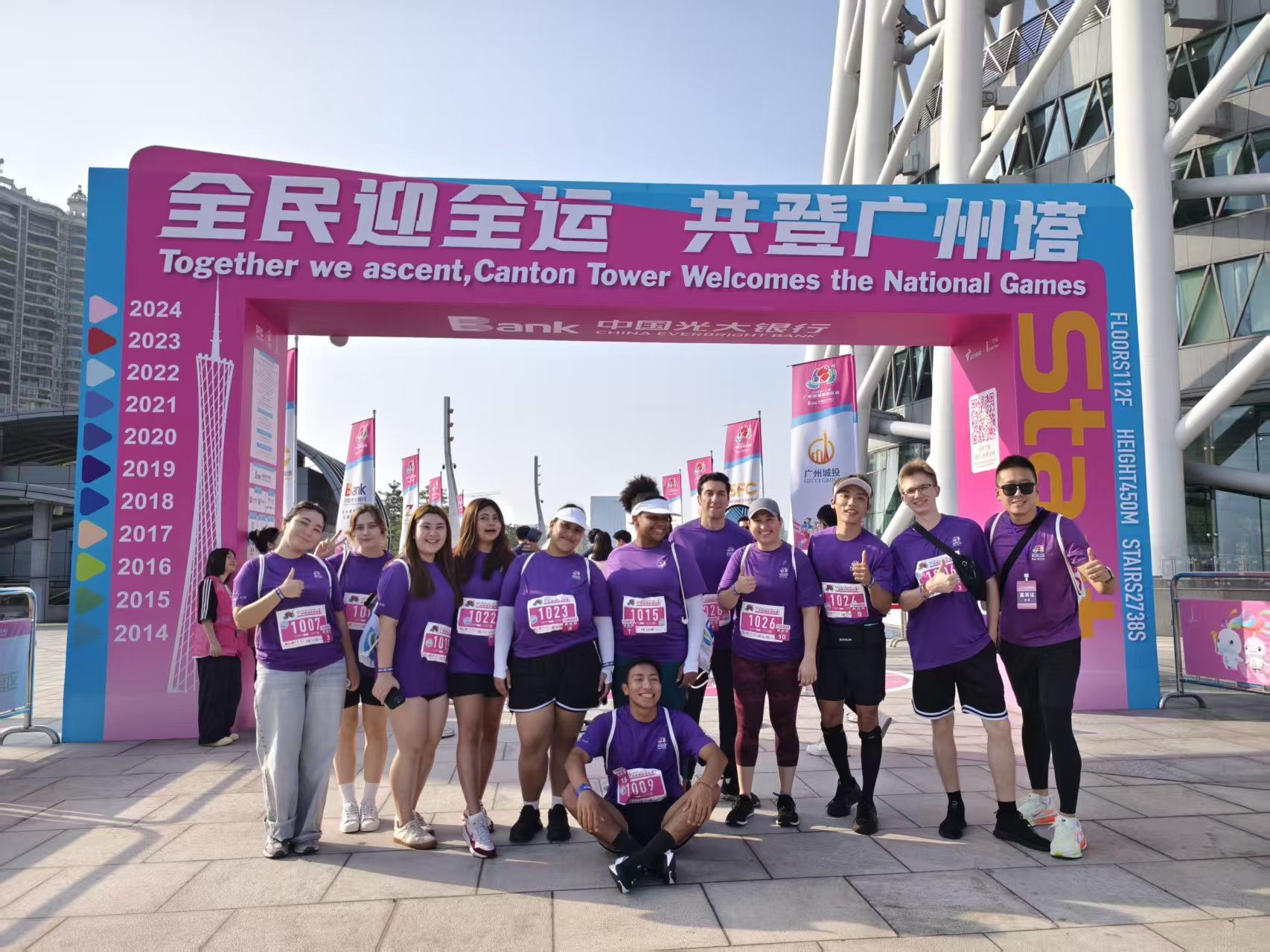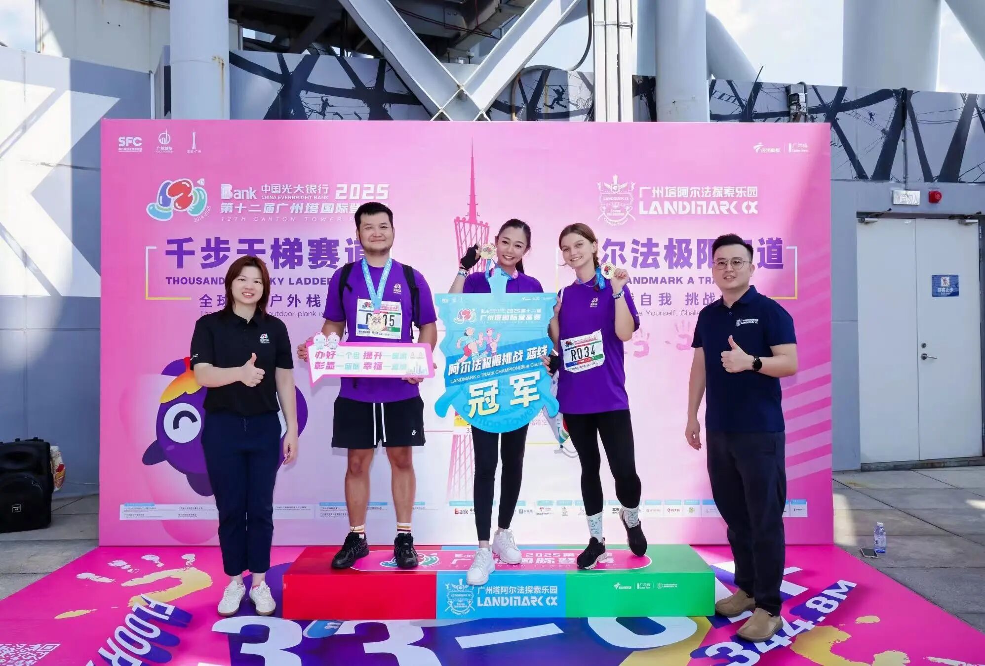 赛道设置于广州塔33层至58层之间,设有绿线、蓝线与红线三条不同难度路线。其中红线赛道高达298米,是全球少有的超高空高塔绳索探险项目,我校三位选手组成的队伍夺得蓝线冠军。