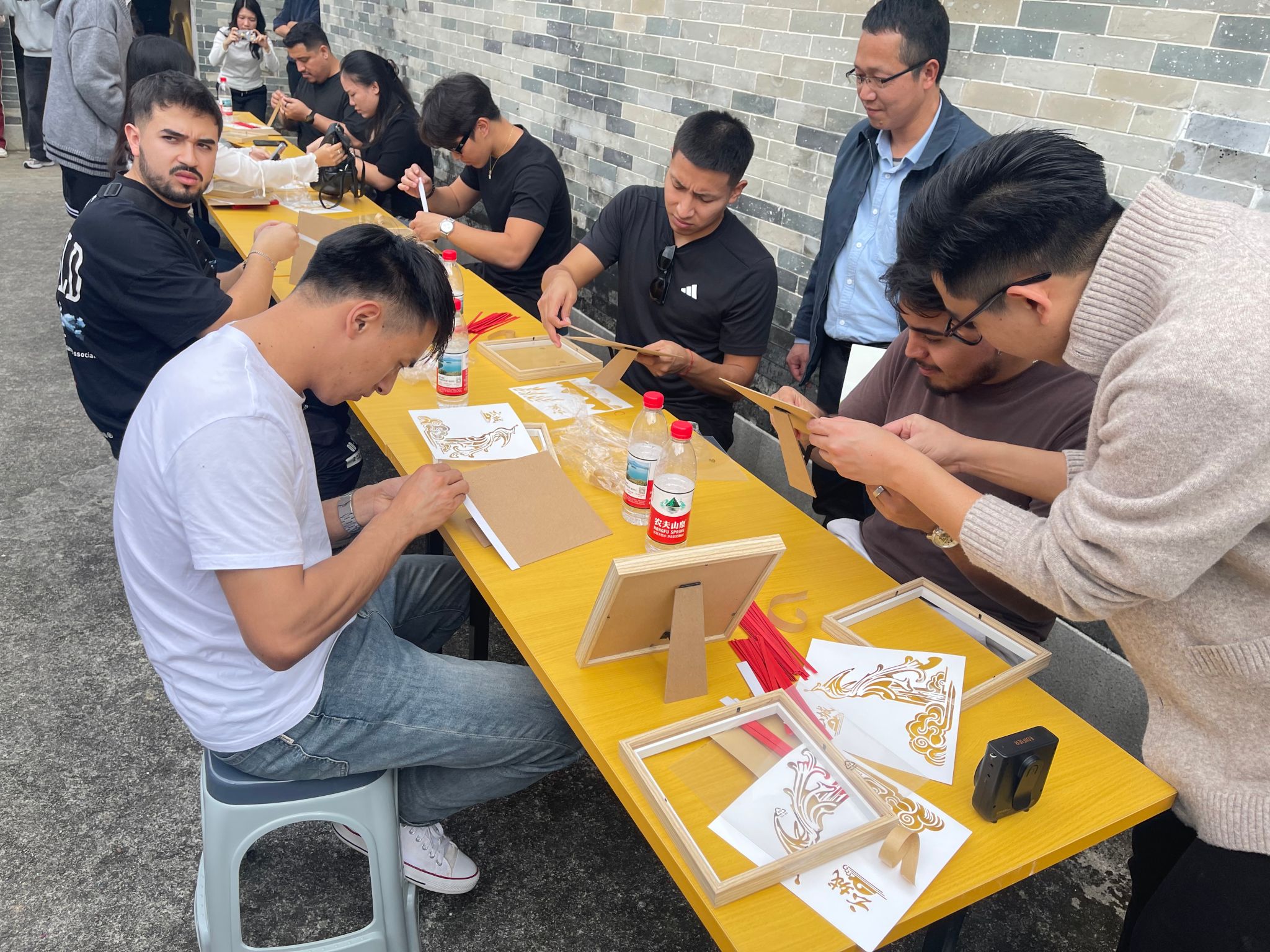当天下午,留学生团队率先抵达云城区博物馆,在讲解员的引领下,驻足观看云城新旧变化图片展,深入了解原云浮县的历史名人事迹与深厚文化脉络。随后,留学生们移步至古色古香的百门大屋,非遗竹编、挥春书写、醒狮武术表演等特色活动依次开展,让大家全方位体验中国年俗魅力。在非遗竹编体验区,留学生们在老师的指导下,认真学习经纬交织的基础技法,十指灵活运作,或按、或拉、或放、或紧,将红色竹篾细心编织,再搭配镂空的云城地标图案,一幅幅立体竹编画作逐步成型。挥春书写环节同样备受青睐,留学生们伏案提笔,蘸墨、运笔、落笔,一笔一划反复练习,将对中国新年的美好期许,倾注到一个个饱满的“福”字之中。
