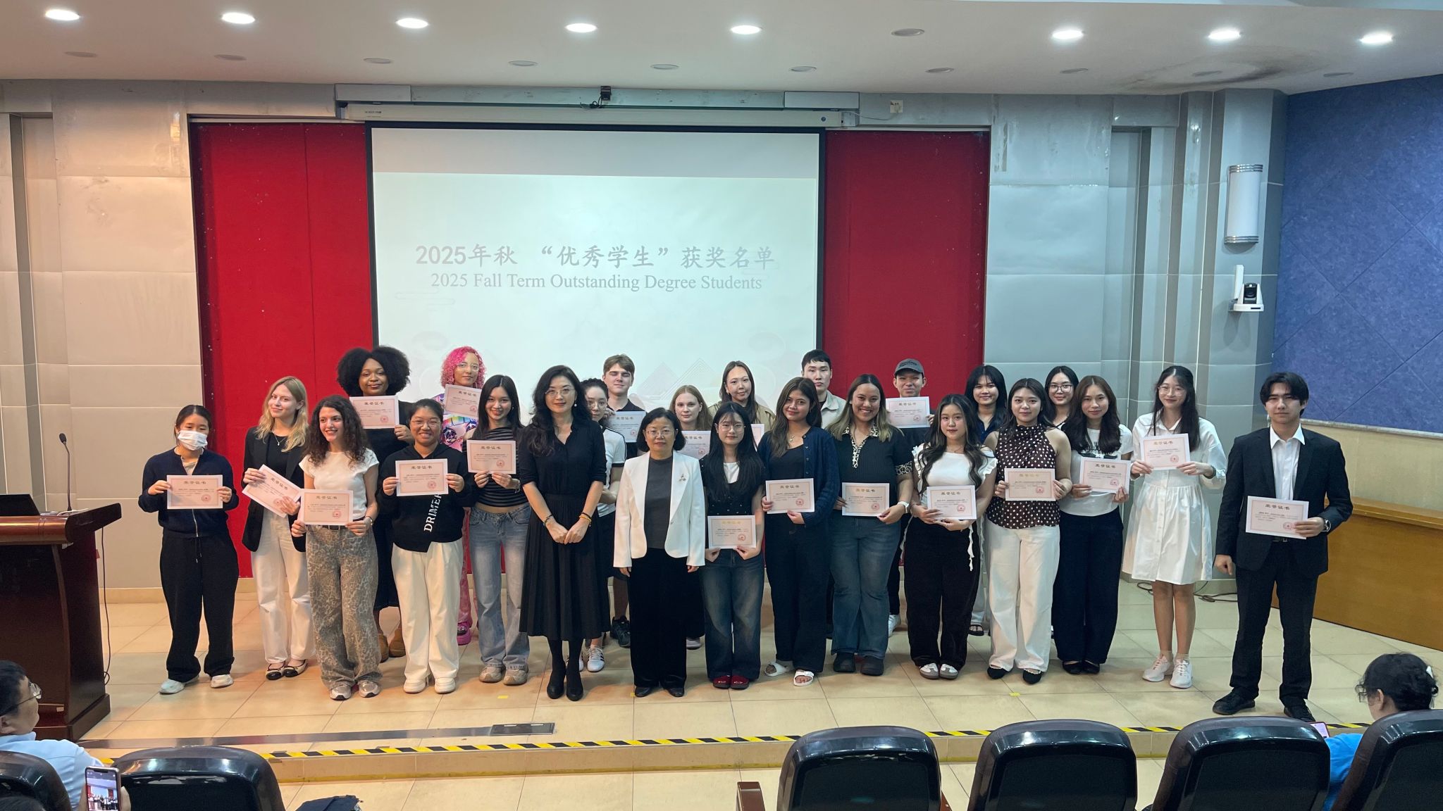 学院对2025年秋季学期表现优异的“优秀学生”和积极参与校园活动的“积极分子”进行表彰,为全体留学生树立学习榜样,激励大家在新的学期锐意进取。