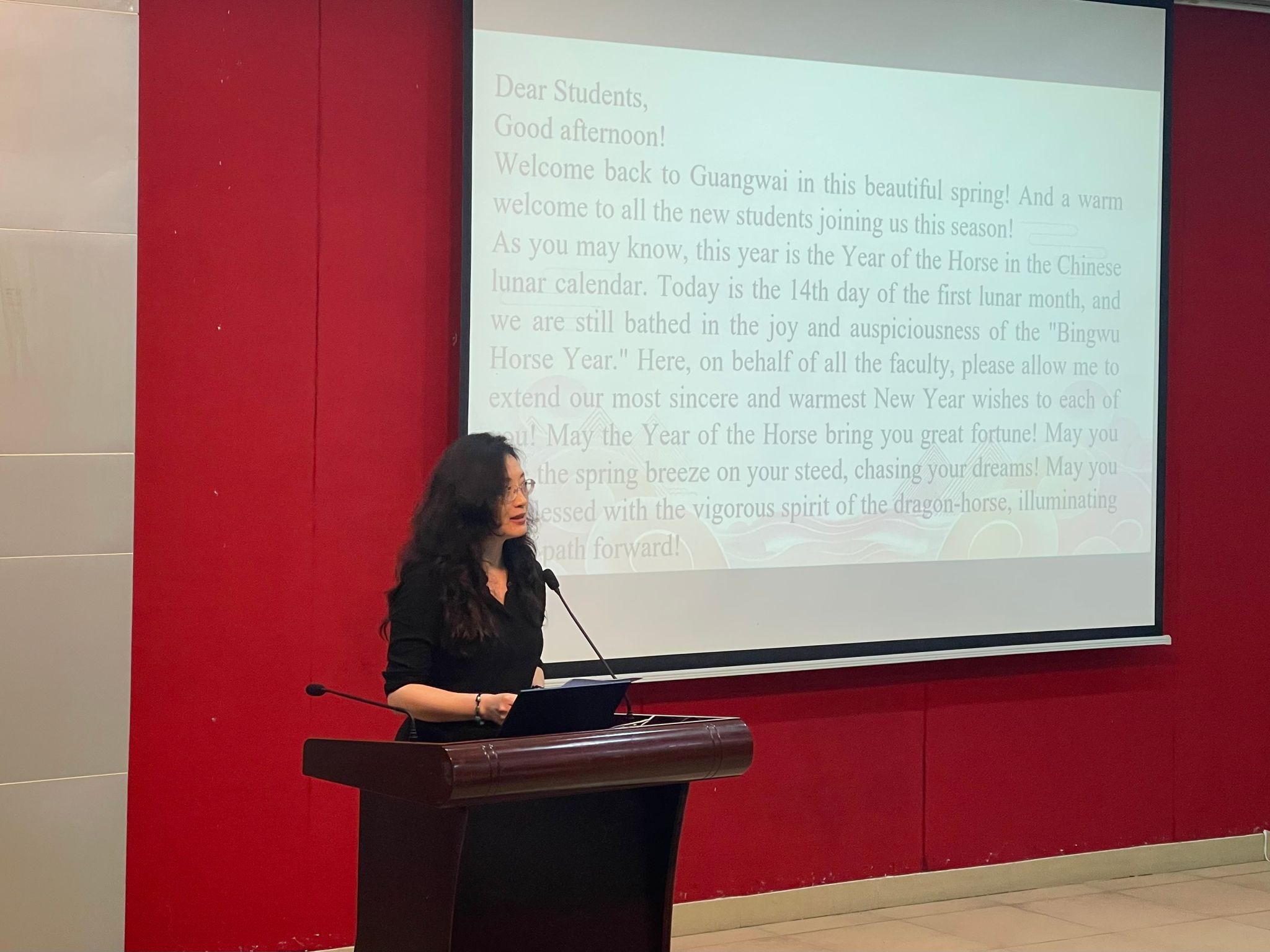 开学典礼上,留学生教育学院院长蔡红发表了题为《以梦为马,不负韶华》的致辞。蔡红院长以“马”为喻,撷取“以梦为马”“一马当先”“驽马十驾”等经典成语,寄语全体留学生将梦想作为前行动力,永葆探索创新的勇气,以持之以恒的努力攻克学习难关,主动走出课堂融入中国社会,更要秉持“万马奔腾”的协作精神,在多元文化交融中携手共进。她希望同学们珍惜青春韶华,在广外的求学之旅中筑梦、追梦、圆梦,最终收获“马到成功”的喜悦。