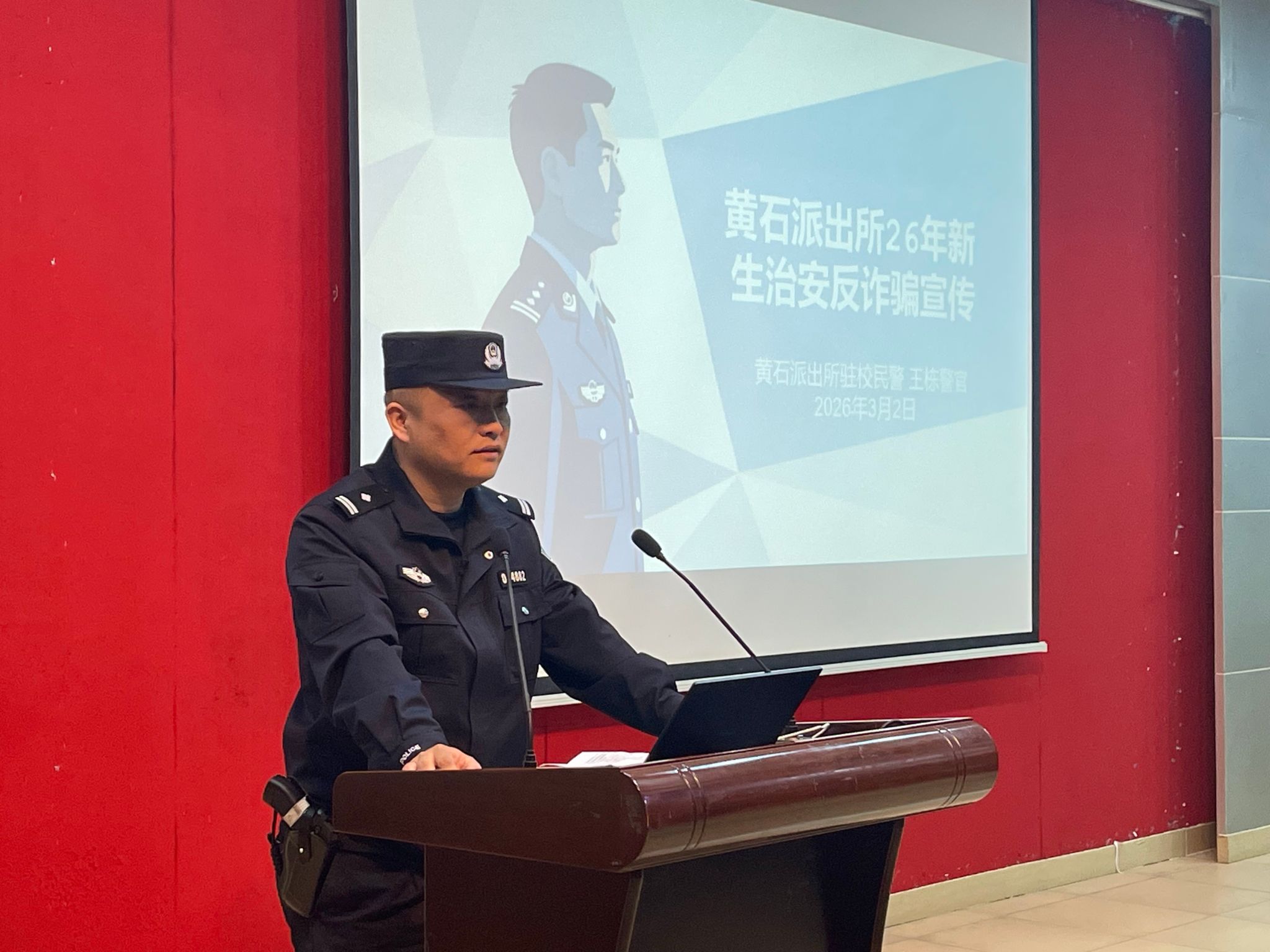 黄石派出所驻校民警王栋警官受邀为留学生开展涉外安全教育专题讲座。王栋警官以涉外治安与反诈骗宣传为核心,结合留学生在华学习生活的实际需求,开展了针对性的安全指导,为留学生们的校园生活筑牢安全防线。