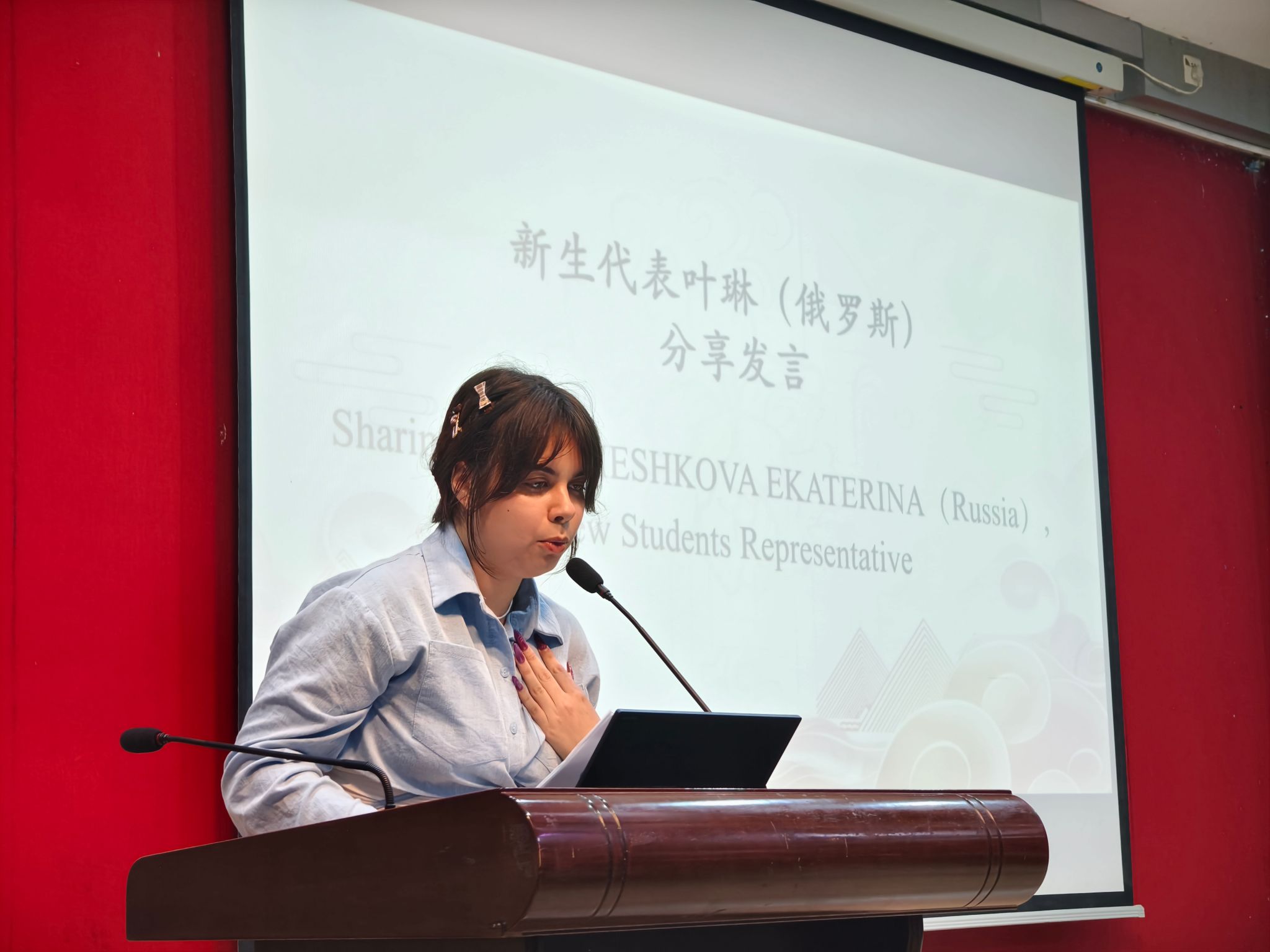 俄罗斯留学生叶琳作为新生代表发言,传递了新生们对新学期的憧憬与期待。她感慨广州的温暖与校园的生机,表达了对深化汉语学习、了解中国文化的期待,并祝愿所有同学新学期达成心中目标。