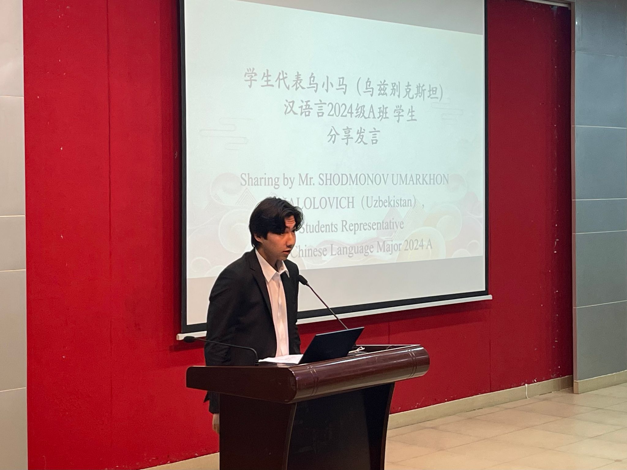 老生代表、汉语言专业二年级学生乌小马分享了自己在广外的学习与生活感悟。他表示,在老师的悉心指导与丰富的校园文化熏陶下,自己不仅提升了汉语水平,更深深爱上了中国传统文化与粤港澳大湾区的独特魅力。他鼓励新生珍惜时光、努力进取,在校园里书写属于自己的精彩篇章。