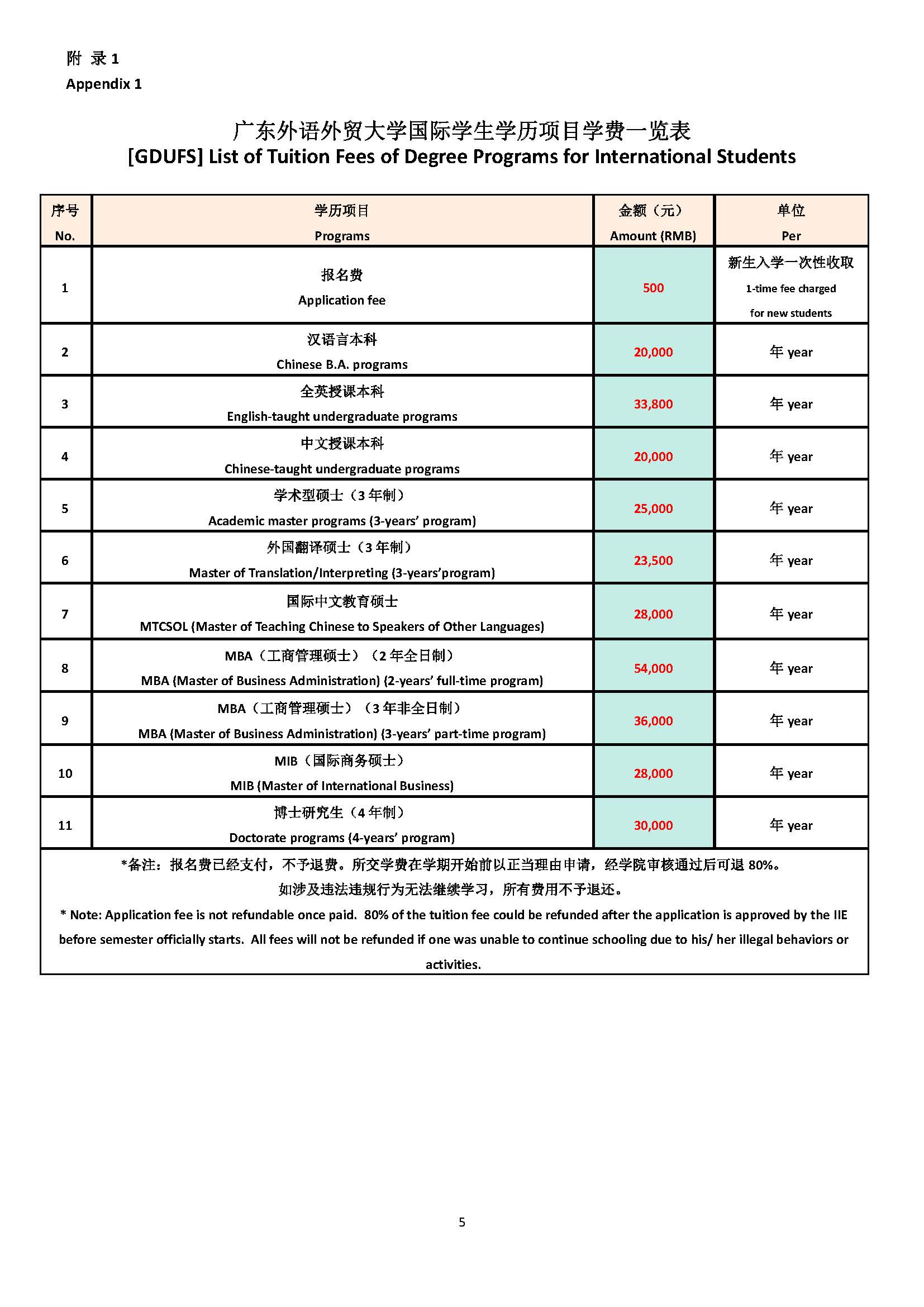 附录1. 广东外语外贸大学国际学生学历项目学费一览表