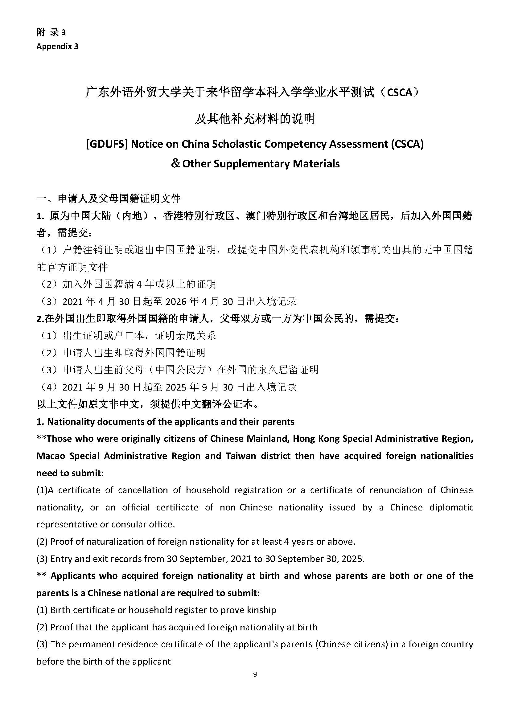 附录3. 广东外语外贸大学关于来华留学本科入学学业水平测试(CSCA)及其他补充材料的说明
