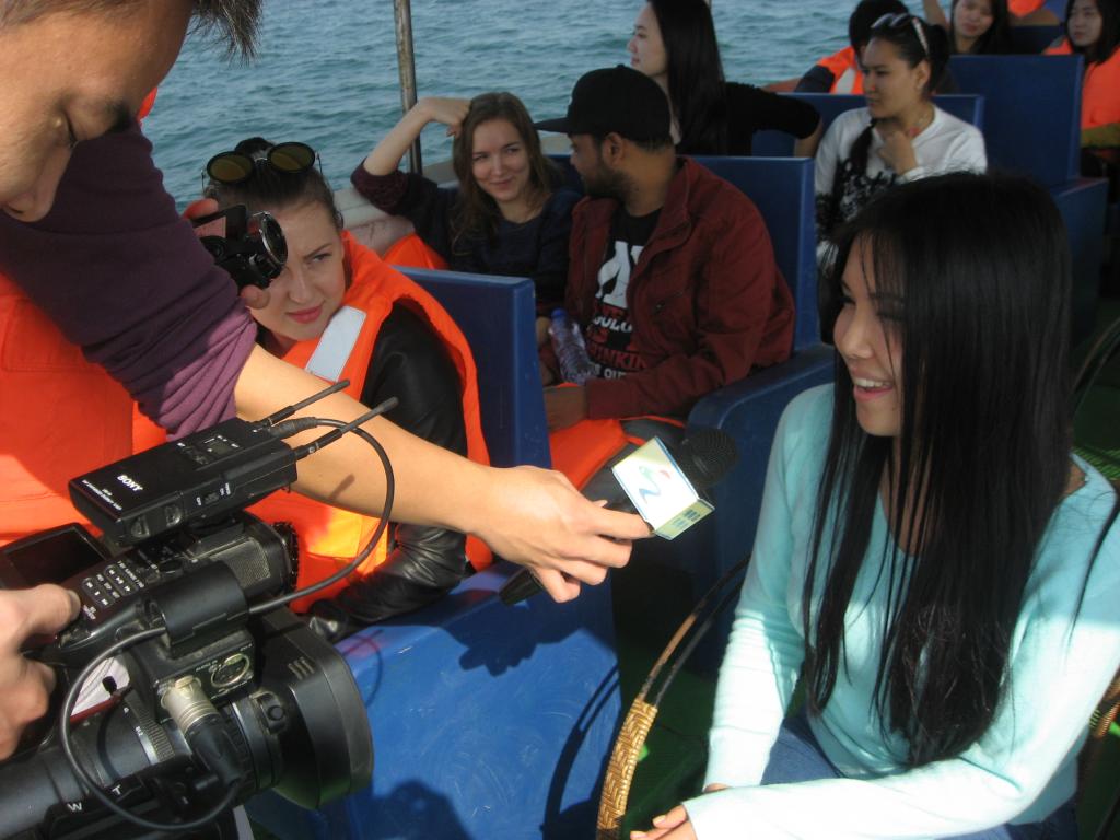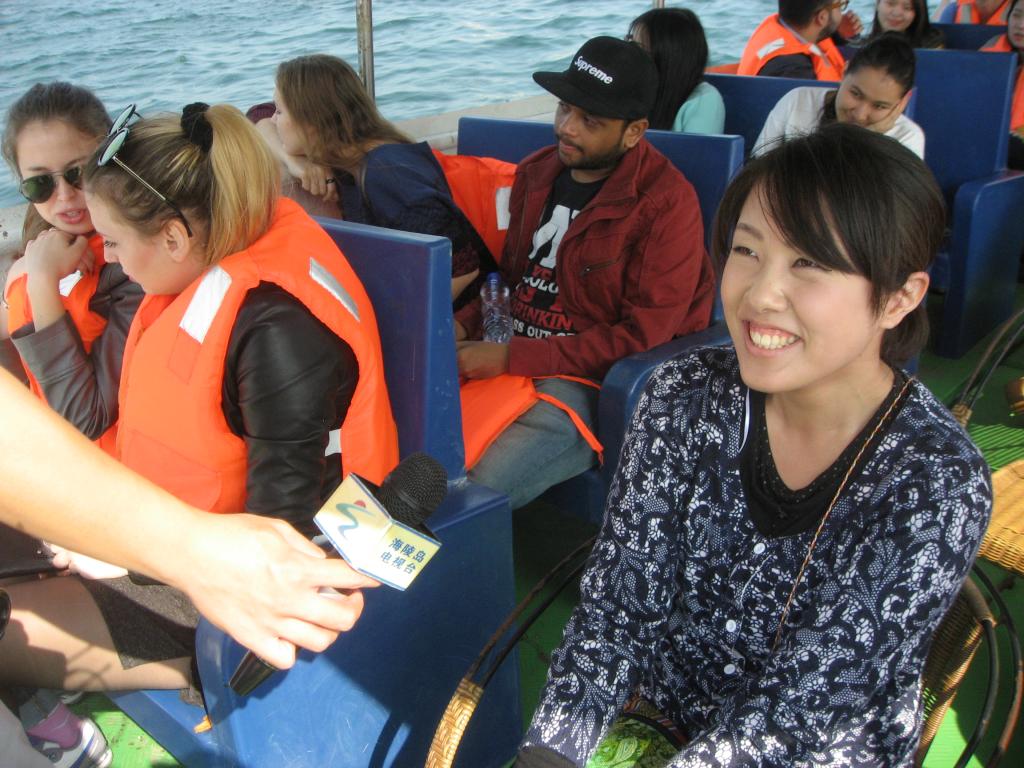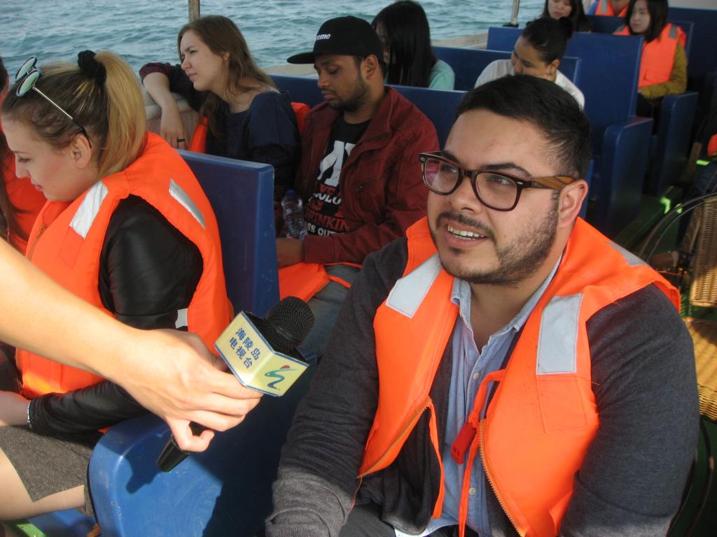 11月16日上午,留学生们在工作人员的带领下参观了海陵岛保利皇冠假日酒店,酒店内环境布置非常漂亮,与沙滩只有几步之遥,留学生们都很喜欢这一景点,一时流连忘返。随后,一行人到达港湾,踏上渔船,扬帆出海,体验捕鱼之乐,感受大海的魅力。海陵区委还安排了海陵岛电视台在渔船上采访了留学生代表。
